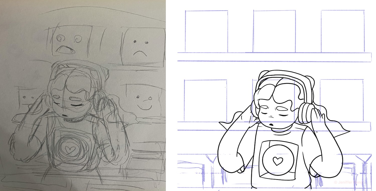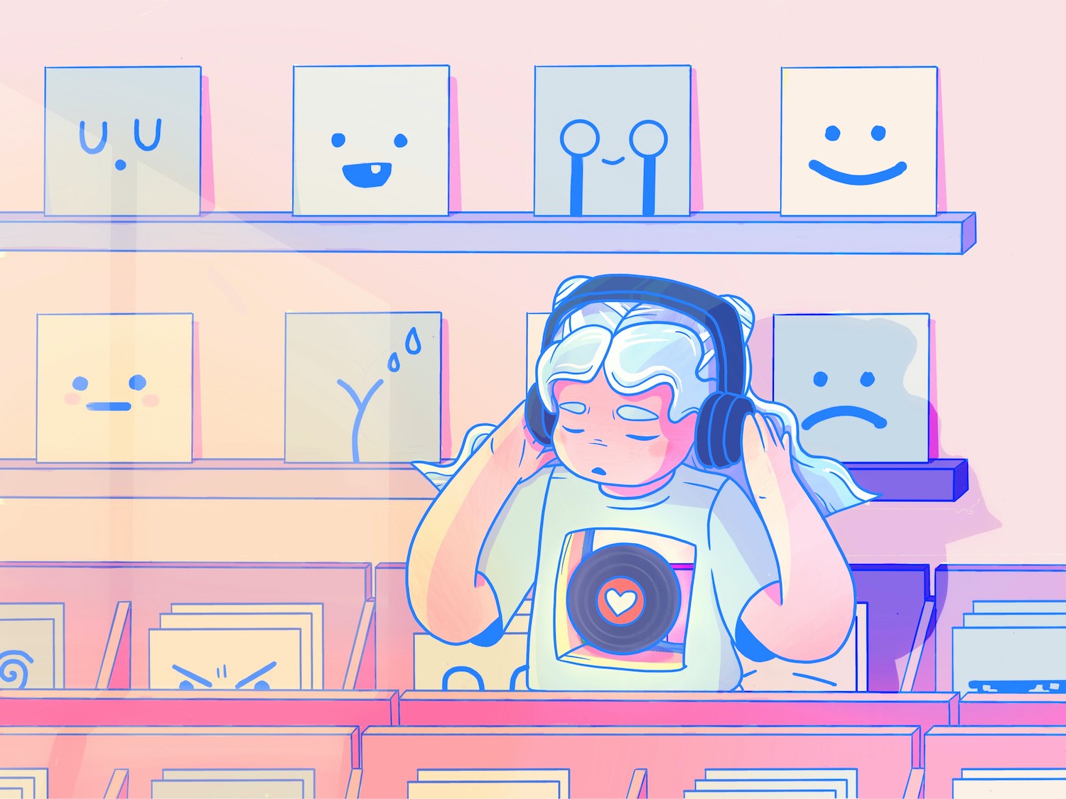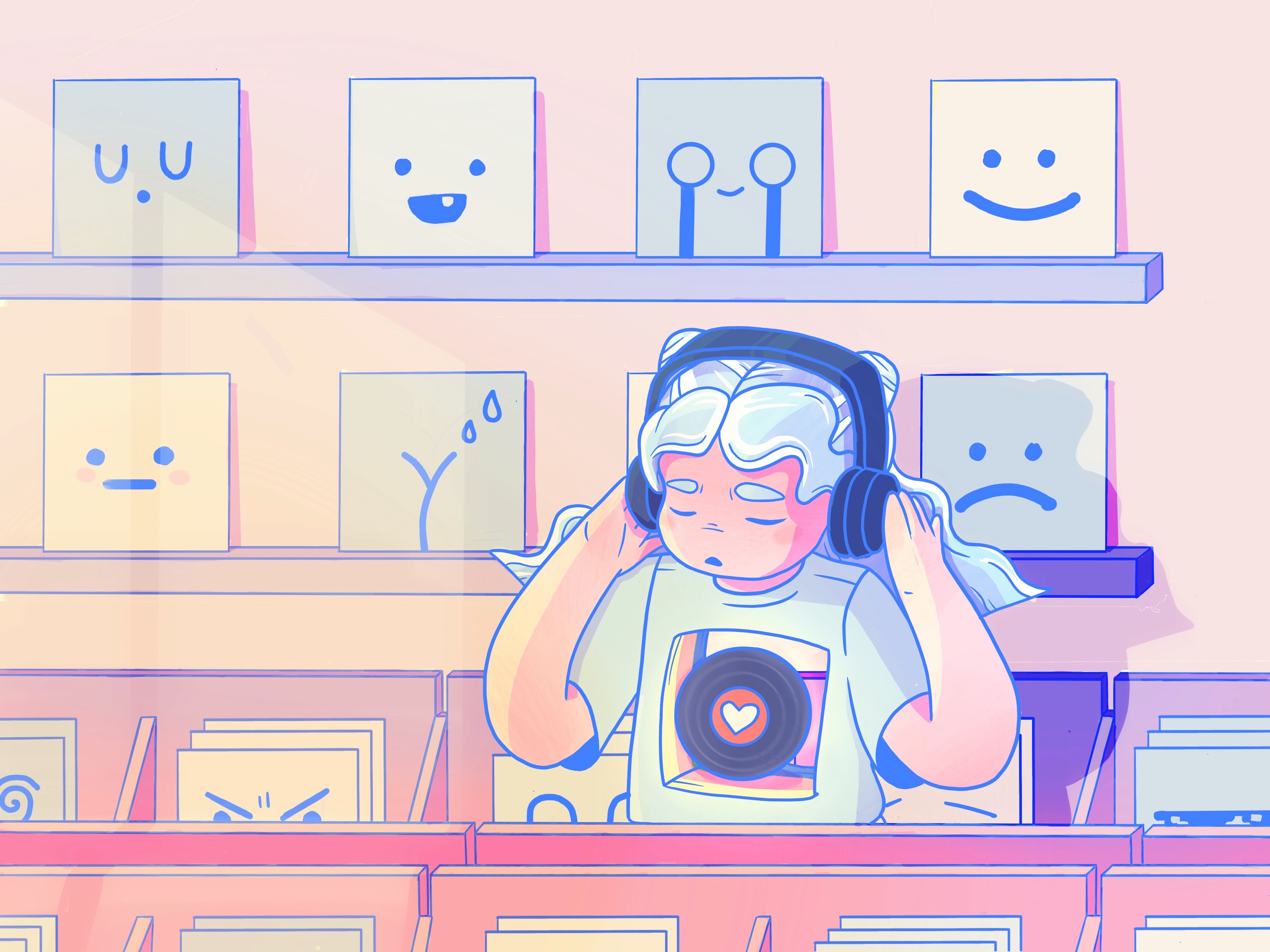 Extending her world, I envisioned her in a record store. To support the narrative, I chose to use various anime-influenced emotive faces as album covers. (Please excuse the messy brush work. I intend to vectorise this series… one day!).